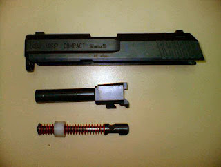 El mecanismo de percusión de una pistola, que es lo que hace que la pistola funcione, y tal, se basa en el lanzamiento por inercia de la antes citada aguja percutora. La aguja percutora está sujeta por un muelle recuperador, y cuando es golpeada por el percutor se desplaza a través de su alojamiento hasta que la punta emerge por la bocina - no me preguntéis qué es, pero no creo que sea importante para entender lo que estoy contando -, y percute en el iniciador del cartucho. Por mediación del muelle recuperador, tras el disparo la aguja percutora vuelve a su posición inicial.